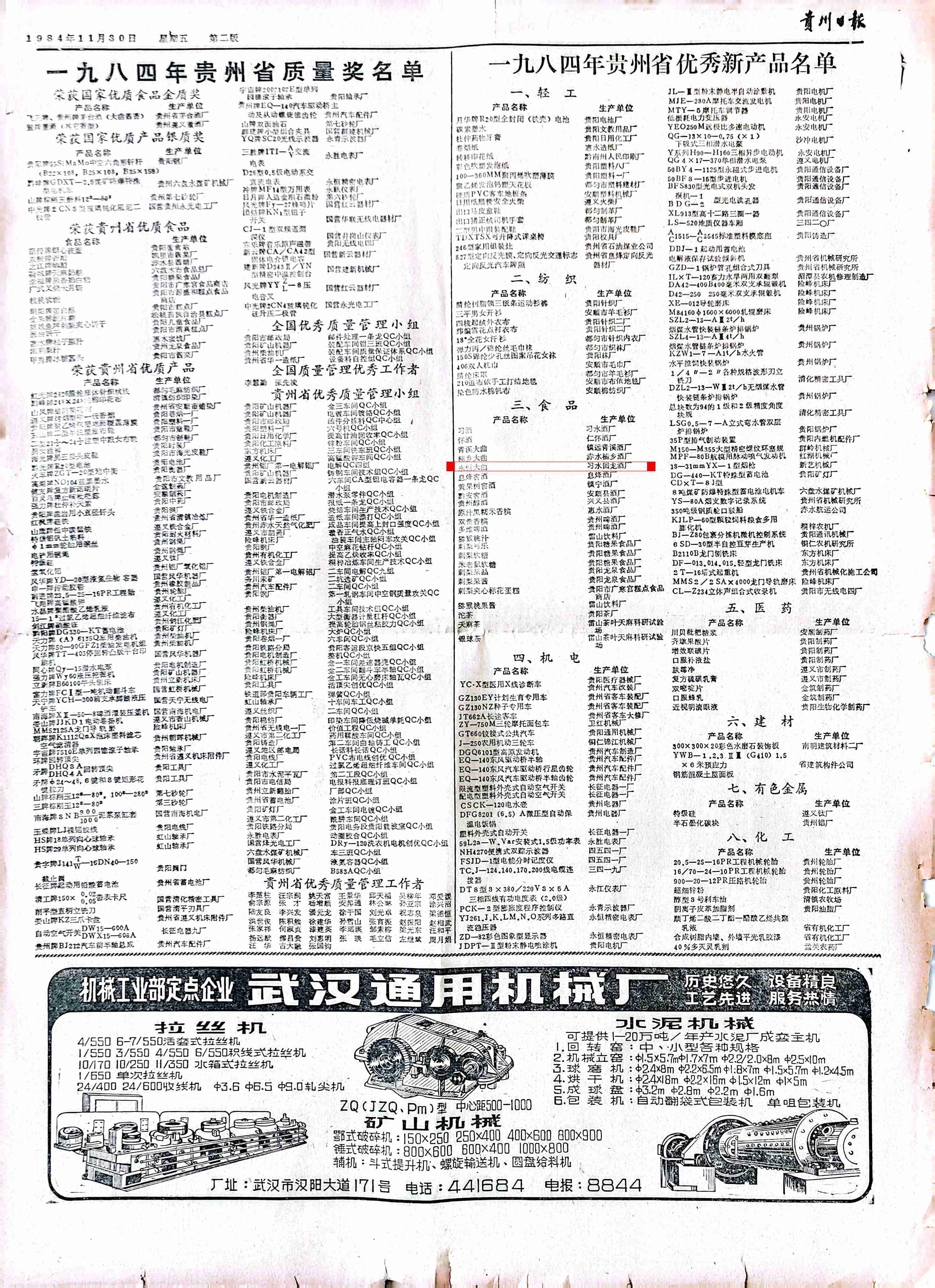 1984年9月“永恒大曲的试制与批量生产”荣获习水县科学技术大会“二等奖”。